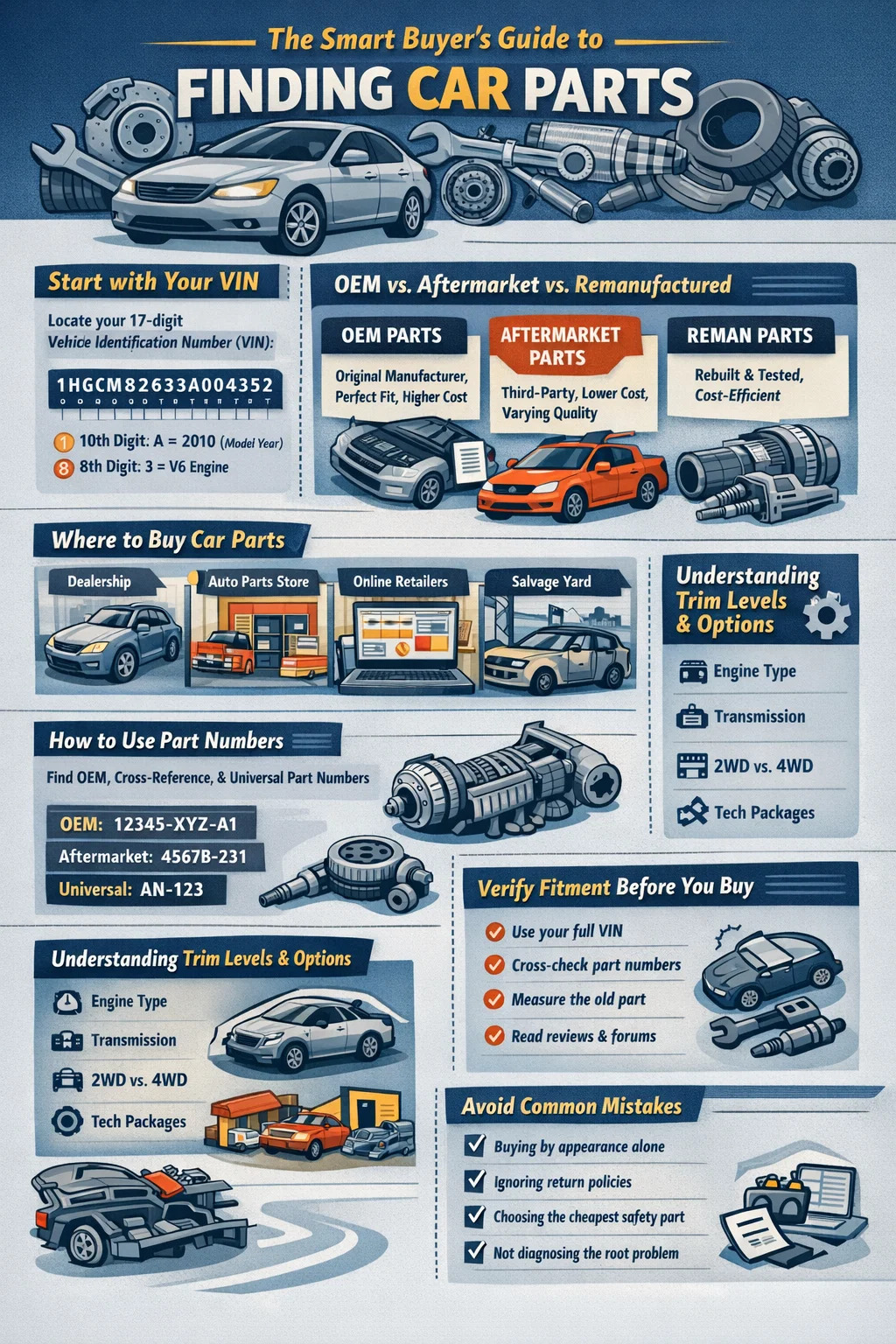 Mencari bahagian yang sesuai untuk kereta anda bergantung kepada satu titik permulaan yang tidak boleh dirunding: anda mesti mengetahui tahun, pembuatan, model, saiz enjin dan tahap trim kenderaan anda sebelum mencari apa-apa bahagian kereta . Tanpa maklumat ini, bahagian yang kelihatan sama boleh gagal untuk dimuatkan atau berfungsi dengan betul. Sebaik sahaja butiran tersebut dikunci, prosesnya menjadi jauh lebih mudah — sama ada anda membeli daripada pengedar, peruncit dalam talian, kawasan simpanan atau kedai alat ganti kereta. Panduan ini berjalan melalui setiap langkah proses itu dengan perincian praktikal.