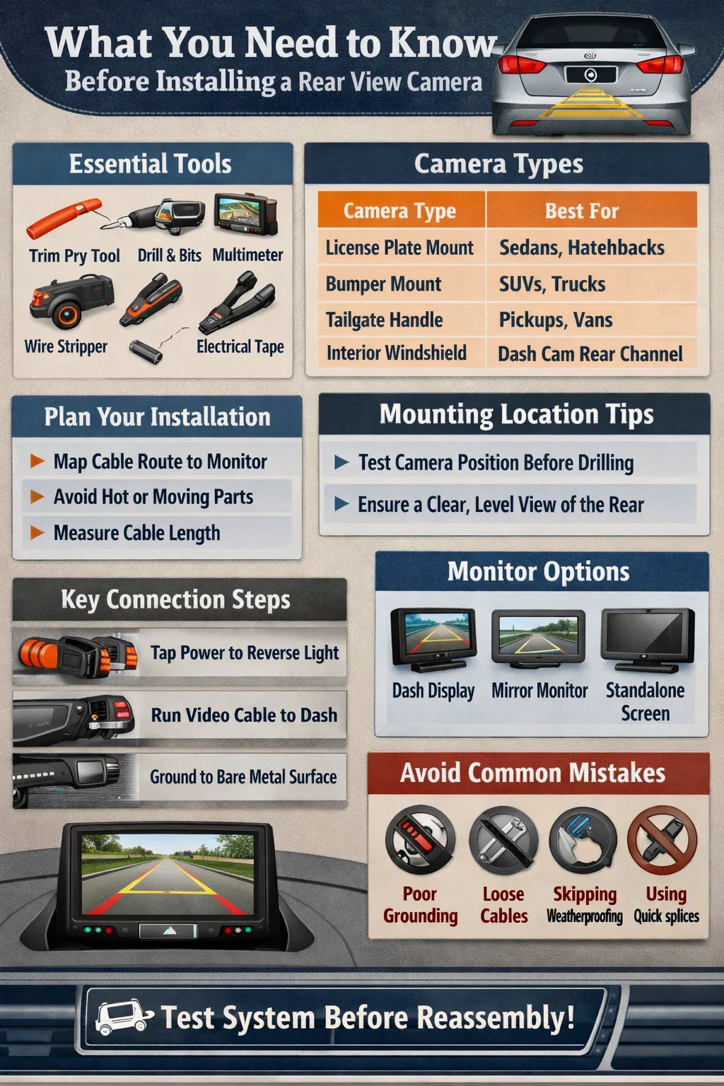 Memasang kamera pandangan belakang kereta ialah projek DIY yang mudah yang boleh disiapkan oleh kebanyakan pemilik kenderaan 1 hingga 2 jam dengan alatan asas. Proses teras melibatkan pemasangan kamera di bahagian belakang kenderaan, penghalaan kabel kuasa dan video melalui bahagian dalam, dan menyambungkan semuanya ke monitor paparan. Sama ada anda menggunakan kereta sedan, SUV, trak pikap atau hatchback, langkah asas kekal konsisten — walaupun jarak penghalaan kabel dan cabaran pemasangan berbeza mengikut jenis kenderaan.