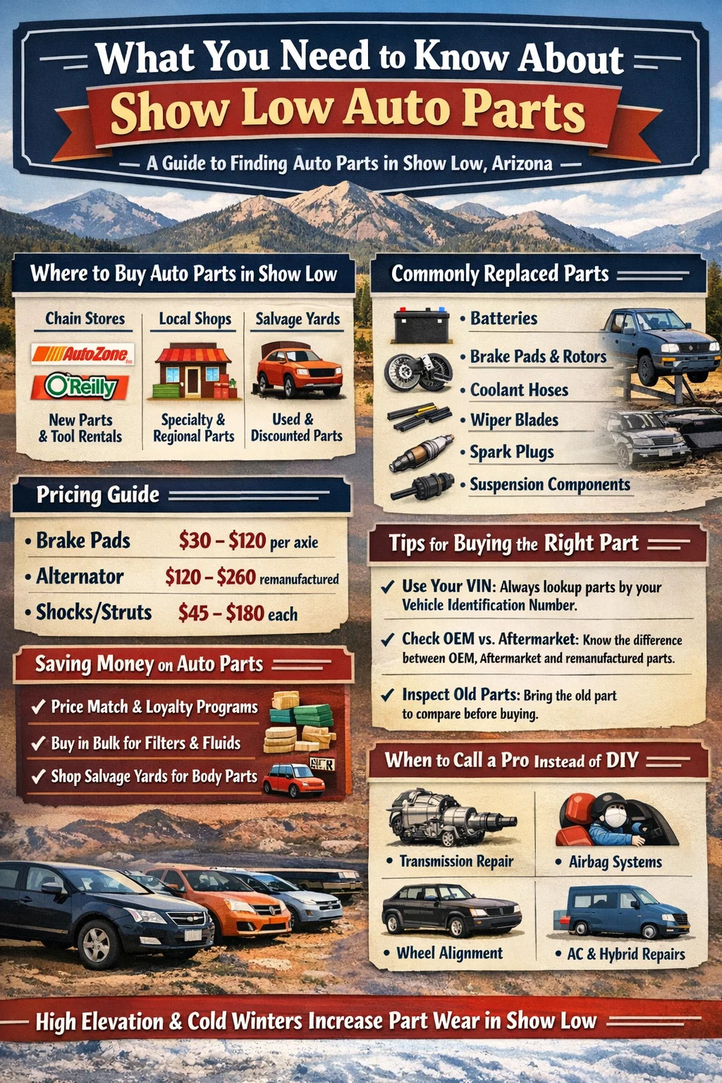 Show Low mempunyai kepekatan kedai pembaikan kereta yang lebih kecil daripada bandar, yang bermaksud masa menunggu boleh lebih lama dan kos boleh lebih tinggi daripada di bandar Arizona. Ini mendorong ramai pemilik kenderaan ke arah pembaikan DIY, yang munasabah untuk banyak pekerjaan. Tetapi sesetengah penggantian alat ganti kereta benar-benar memerlukan peralatan profesional, pengalaman, atau kedua-duanya.
