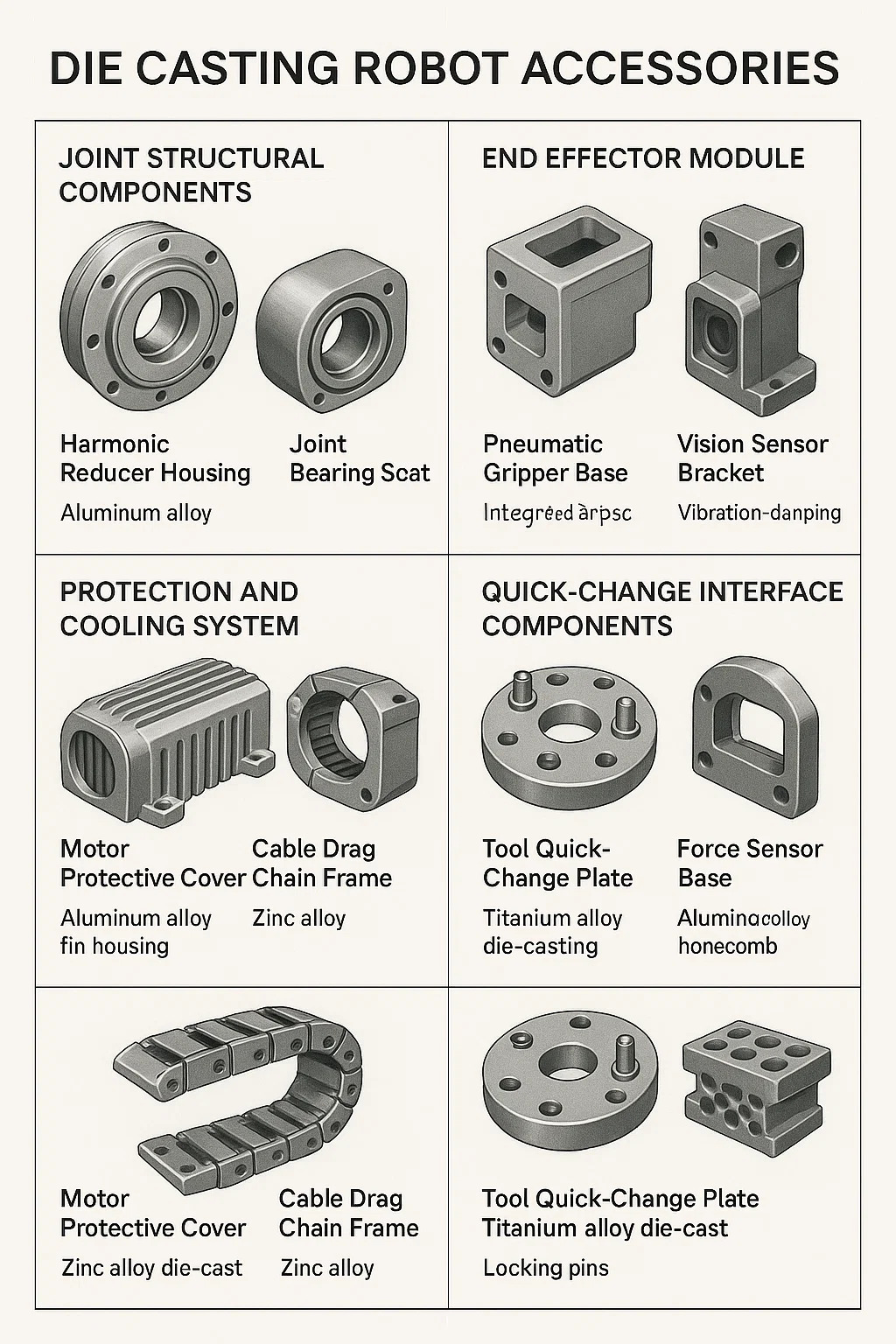 Magnesium aloi die-cast, mampu menahan 1 tan beban dinamik sambil mengurangkan berat badan sebanyak 30% (meningkatkan ketahanan robot logistik sebanyak 2 jam).