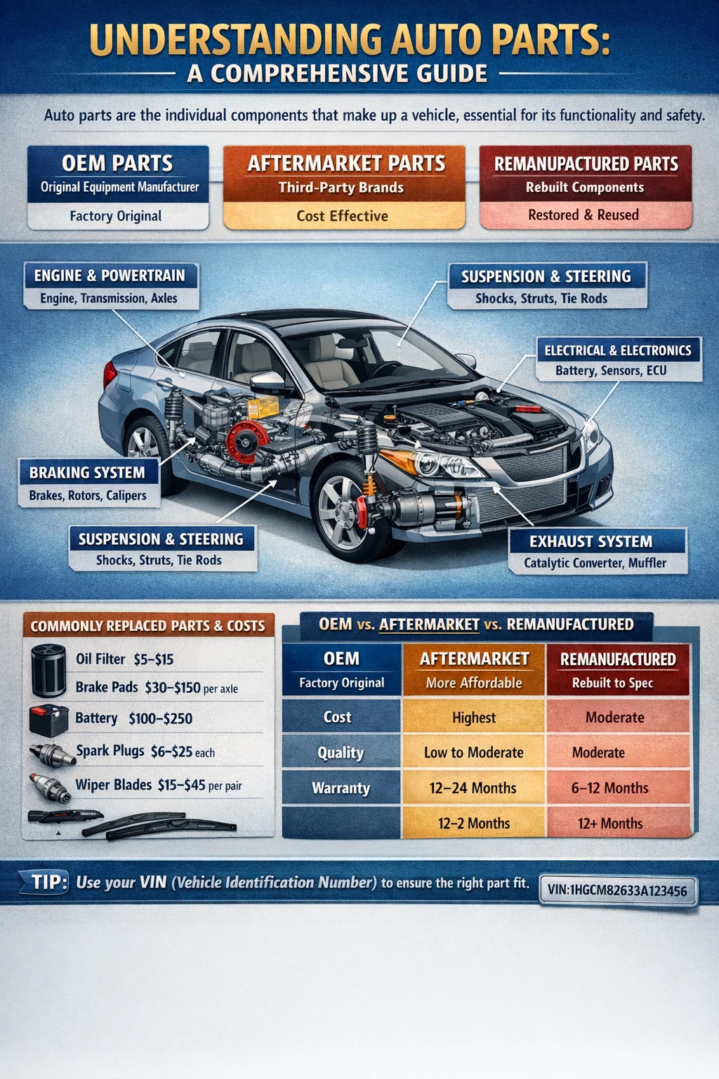 Pada peringkat paling asas, bahagian kereta terbahagi kepada dua kategori yang luas: Bahagian OEM (Pengilang Peralatan Asal). and alat ganti selepas pasaran . Alat ganti OEM dihasilkan oleh atau untuk pengeluar asal kenderaan dan adalah sama dengan apa yang disertakan dengan kereta dari kilang. Alat ganti selepas pasaran dibuat oleh syarikat pihak ketiga dan mungkin berbeza dari segi kualiti, harga dan kesesuaian. Kategori ketiga — bahagian yang dikilang semula atau dibina semula — merujuk kepada komponen terpakai yang telah dipulihkan untuk memenuhi spesifikasi prestasi asal.