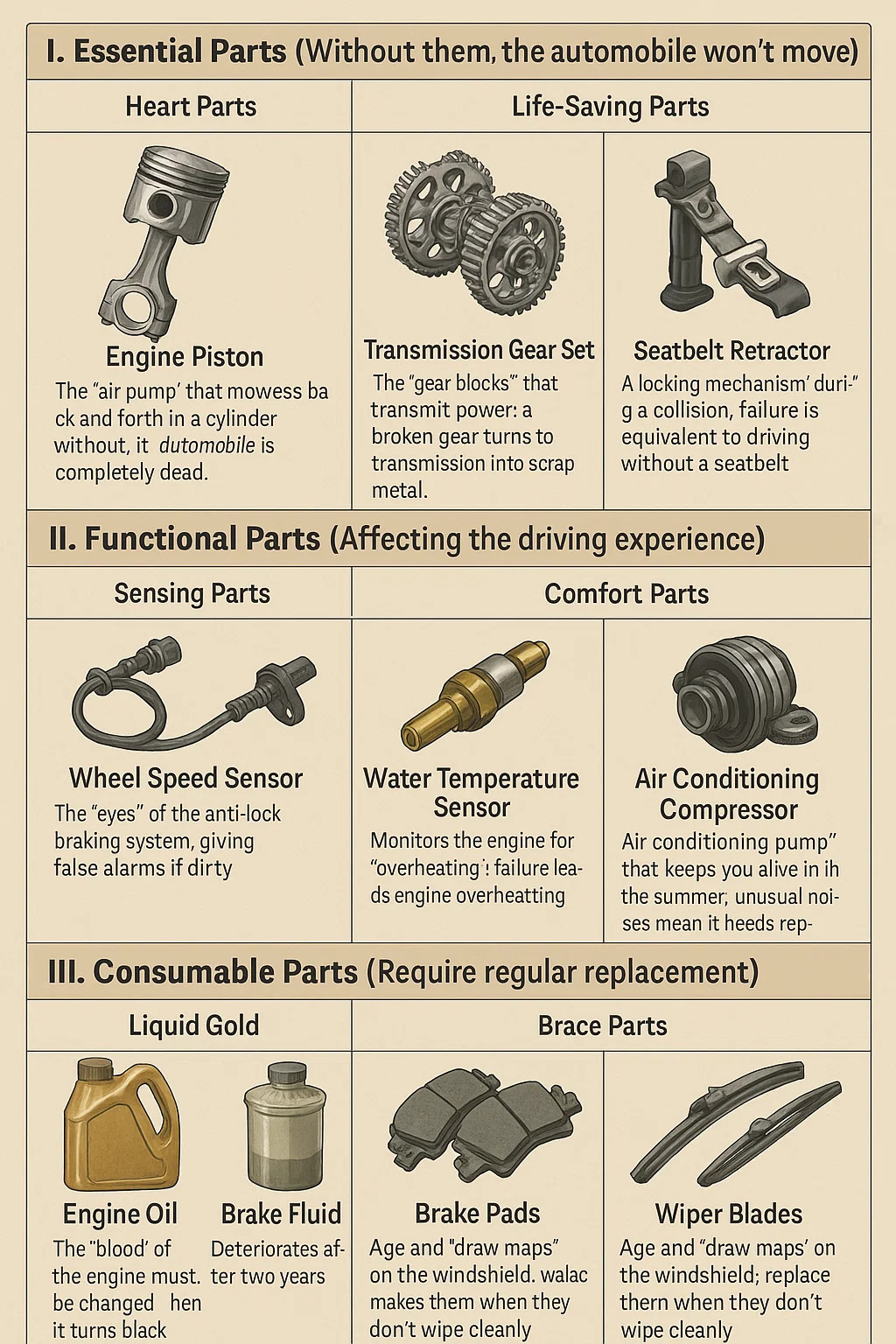 Bahagian kereta adalah "organ" yang membentuk sebuah kereta; Hilang bahagian penting menjadikan kereta tidak dapat digunakan, sementara bahagian hiasan tambahan hanya menjadikannya lebih mencolok.