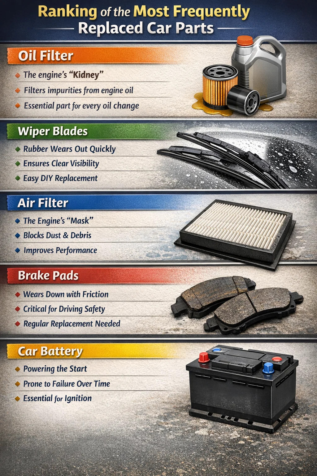 Dalam penggunaan harian kereta, sesetengah bahagian adalah seperti stoking atau tapak kasut yang kita pakai – ia adalah "bahan habis pakai" yang mesti diganti dengan kerap. Jika kita terpaksa memilih bahagian kereta yang perlu ditukar paling kerap, ia pastinya adalah penapis dan alat ganti haus.