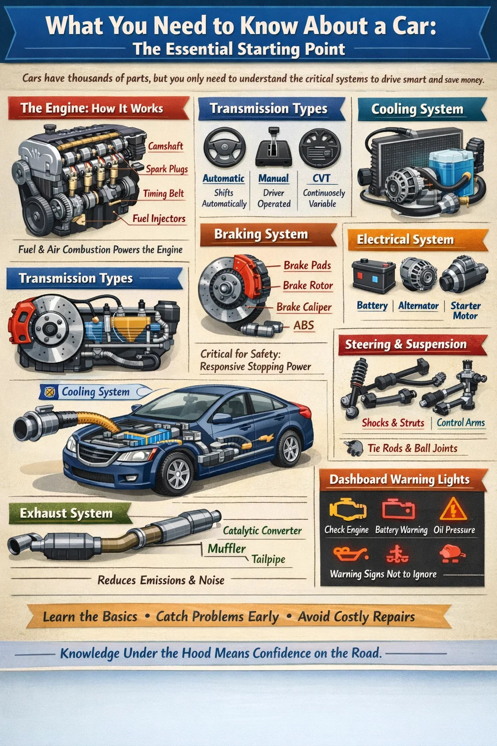 Setiap kereta di jalan raya adalah koleksi sistem yang saling berkaitan, dan anda tidak perlu menjadi mekanik untuk memahaminya. Kenderaan biasa mengandungi kira-kira 30,000 bahagian individu , tetapi sebahagian besar pemilik kereta hanya perlu memahami sebahagian kecil daripada mereka untuk kekal selamat, menjimatkan wang dan membuat keputusan termaklum di kedai pembaikan. Panduan ini menelusuri bahagian dan sistem kereta yang benar-benar penting kepada pemandu setiap hari — daripada apa yang terdapat di bawah hud kepada perkara yang memastikan perjalanan anda lancar dan brek anda responsif.